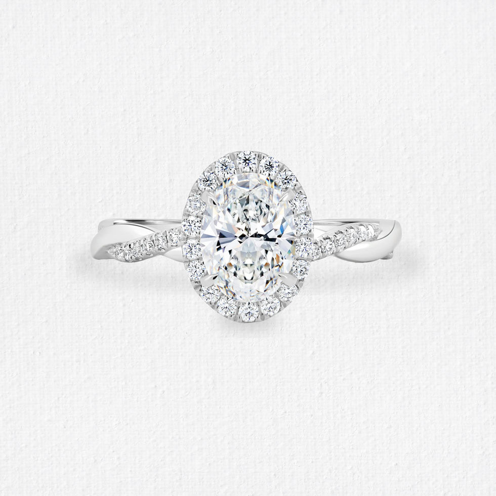The Ophelia ring features a dazzling oval-cut centre stone surrounded by a delicate halo, enhancing its brilliance and giving the illusion of a larger stone. The band showcases a refined design—where an intertwined pavé gracefully wraps around a sleek plain band, symbolising two paths becoming one. A romantic, timeless design that feels both classic and unique.
