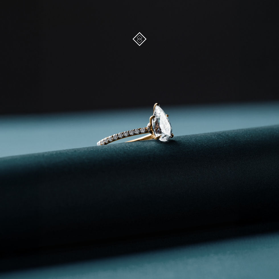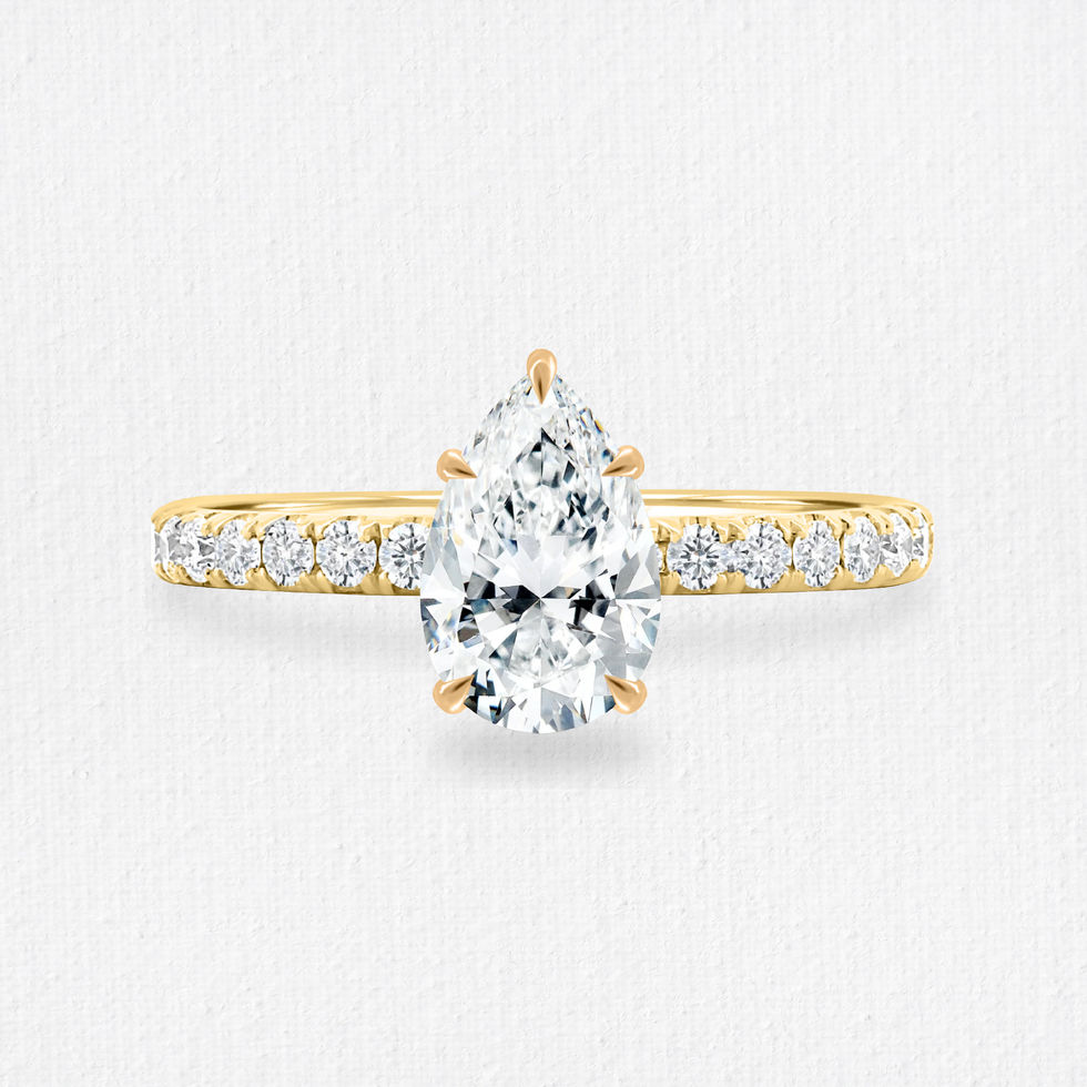 The Paige ring features a captivating pear-cut center stone, gracefully elongated to flatter the finger. A delicate pavé band adds shimmer from every angle, while a hidden donut halo nestles beneath the center stone—offering a subtle sparkle that only reveals itself upon closer glance.