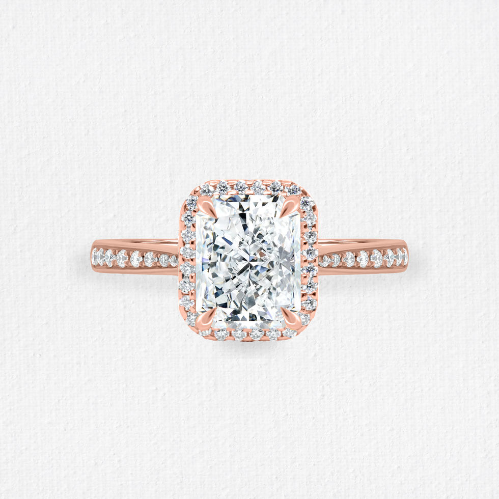 Rose is a romantic 1ct radiant-cut engagement ring, framed by a shimmering halo that enhances its brilliance. The centre stone is elevated with a tapered pavé band, offering a graceful silhouette that narrows toward the diamond—highlighting its beauty from every angle.