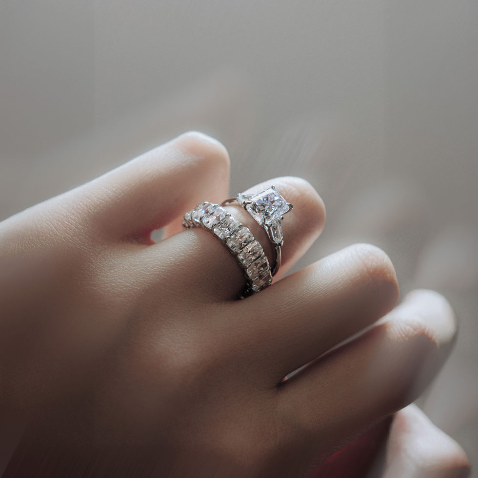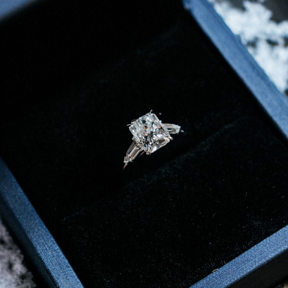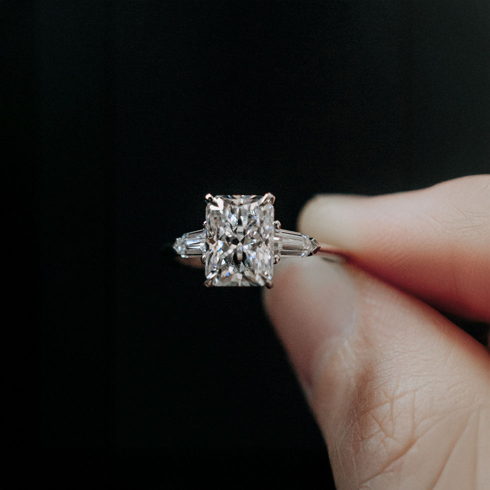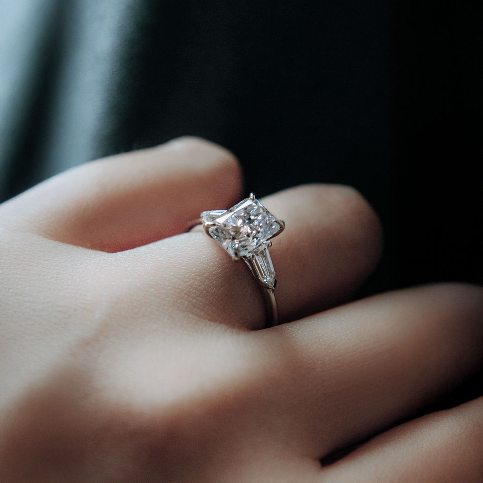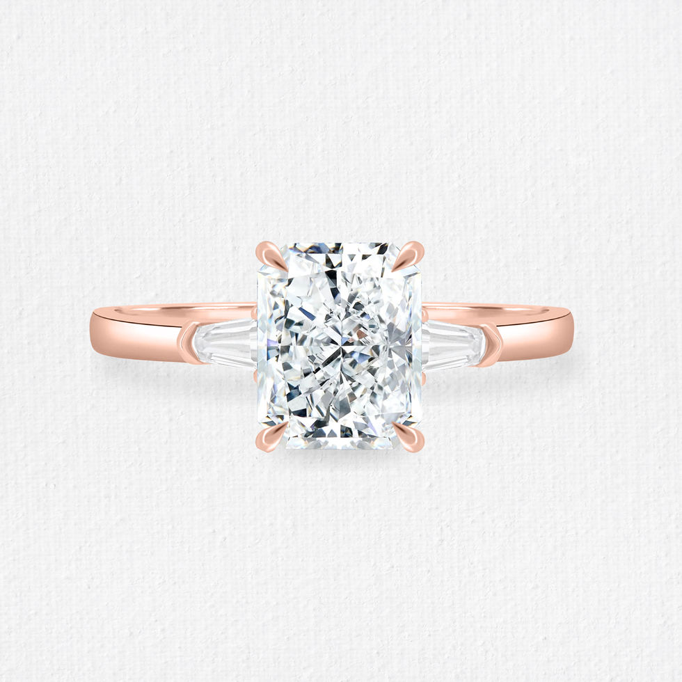 Rowan is a bold and sophisticated trilogy engagement ring, showcasing a striking 2ct radiant cut centre stone flanked by two perfectly proportioned trapezoid side stones. Set on a sleek, polished plain band, this design exudes strength, balance, and timeless elegance.
